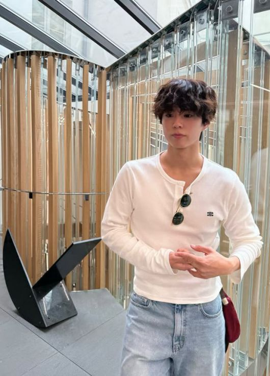 셔츠 위에는 선글라스를 걸쳐 스타일링의 마무리를 더했고, 데님 팬츠는 허리를 살짝 강조하는 슬림핏의 실루엣을 연출했다. 전체적으로 젠더리스하면서도 부드러운 감성이 느껴지는 룩이다.