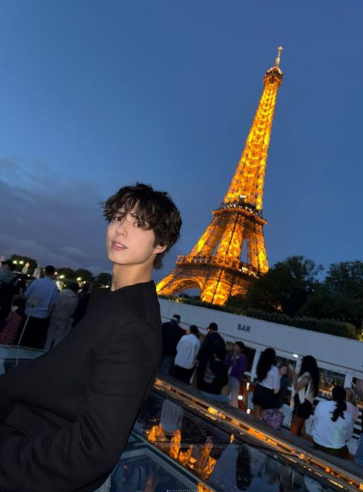 이날 에펠탑을 배경으로 한 야경 사진에서는 올 블랙 스타일링으로 시크한 무드를 연출했다. 버튼 디테일이 더해진 블랙 재킷에 동일한 톤의 이너와 팬츠를 매치해 통일감을 주었고, 데님과 블랙 벨트를 활용해 캐주얼한 포인트를 더했다.