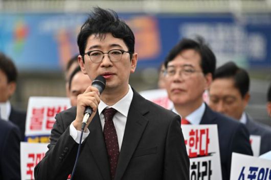 주진우 국민의힘 의원이 1일 서울 용산구 대통령실 앞에서 열린 현장 의원총회에서 발언하고 있다. 정다빈 기자 |