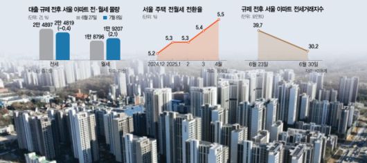 반면 2023년 3월(123만 8000원) 이후 서울 아파트 평균 월세 가격은 27개월 연속 증가했다. 지난해 12월 134만 1000원 이었던 평균 월세는 올해 5월 기준 141만 5000원으로 6개월 새 8만 4000원이 올랐다. 장소희 전문위원은 “이번 대출 규제 정책으로 인해 임차인이 신축 아파트에서 거주할 수 있는 방법도 전액 현금 또는 일부 보증금을 월세로 돌려 사는 방법밖에 없어서 월세 거래가 늘어나고 가격도 더 상승할 것으로 보인다”고 분석했다.