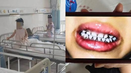 중국서 납중독 의심으로 병원에 입원한 유치원생들(왼쪽)과 치아 일부가 검게 변한 원생. 출처=웨이보 |