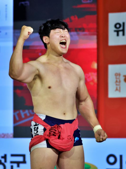 오창록이 8일 보은국민체육센터에서 열린 2025 민속씨름리그 3차 보은대회 한라장사 결정전에서 우승을 확정한 직후 주먹을 불끈 쥐며 포효하고 있다. 대한씨름협회 제공 |