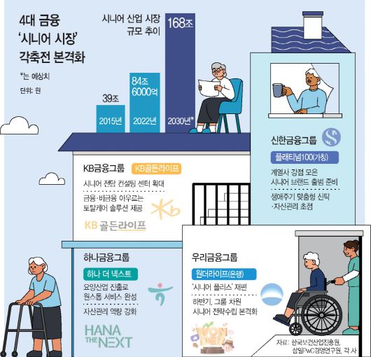 대한민국이 지난해 초고령사회에 진입하자, 100조 규모의 시니어 시장이 금융사들의 새로운 격전지로 떠올랐다. 주요 금융그룹들은 시니어 사업을 강화하기 위해 그룹 내 계열사가 뭉친 특화 브랜드를 구축하며 시니어 고객 유치에 나서고 있다.