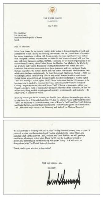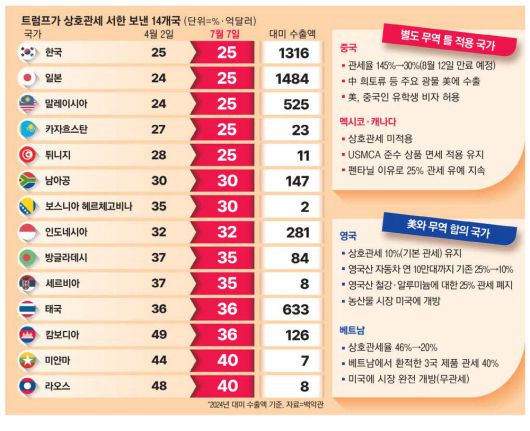 이날 서한으로 공개된 14개국 가운데 한국은 일본 등과 함께 25% 관세율을 통보받았다. 이는 이날 서한을 통보받은 국가 중 가장 낮은 관세율이다. 한국은 기존 상호관세율이 유지됐지만, 일본은 1%포인트 상향 조정됐다. 이날 가장 높은 관세율인 40%를 통보받은 국가는 미얀마, 라오스 등이다.