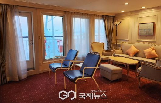 (일본=국제뉴스) 유지현 기자 = 27일 부산항국제여객터미널을 출항해 일본 사세보로 향하는 크루즈 이스턴 비너스(Eastern Venus) 호의 로얄 스위트룸.