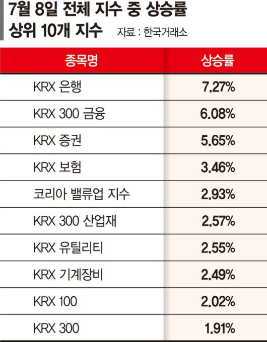 8일 한국거래소에 따르면 이날 내수주 관련 지수인 'KRX 은행'(7.27%), 'KRX 300 금융'(6.08%), 'KRX 증권'(5.65%), 'KRX 보험'(3.46%) 등이 일제히 상승하며 상승률 상위 1~4위를 차지했다. 조선·방산 관련주가 포함된 'KRX 300 산업재' 지수도 2.57% 올라 상승률 상위 7위에 이름을 올렸다.