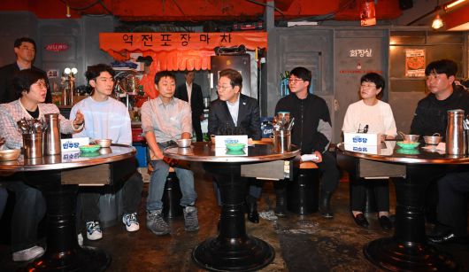 이재명 대통령이 대선 후보 시절인 지난 5월1일 서울 종로구 한 식당에서 ‘당신의 하루를 만드는, 보이지 않는 영웅들’이란 주제로 열린 간담회에서 배달 라이더, 택배 기사 등 비(非)전형 노동자들의 발언을 듣고 있다. 연합뉴스 |