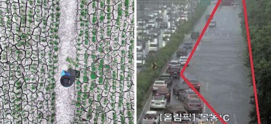 한날 폭염·폭우 ‘롤러코스터’ 폭염이 지속되고 있는 제주 서귀포시 하논분화구 내 논바닥이 8일 쩍쩍 갈라져 있다. 오른쪽은 이날 오후 서울에 갑작스러운 폭우가 내리면서 목동 IC 인근 도로가 침수된 모습. 서울도 한낮 폭염이 이어졌으나 오후 기습 폭우로 구로구 고척동 아파트 단지와 양천구 목동교 인근, 양화대교 인근 등 일부 도로가 침수됐다. 연합뉴스 |