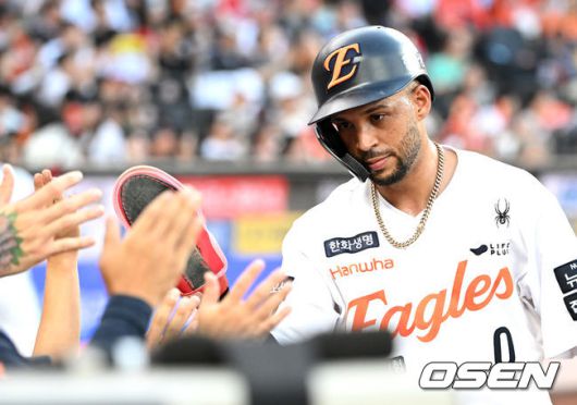 [OSEN=대전, 이대선 기자] 8일 오후 대전 한화생명볼파크에서 2025 신한 SOL Bank KBO리그 한화 이글스와 KIA 타이거즈의 경기가 열렸다. 한화는 문동주, KIA는 윤영철을 선발로 내세웠다. 1회말 무사 2,3루에서 한화 노시환의 좌전 적시타 때 홈을 밟은 3루주자 리베라토가 더그아웃에서 환호하고 있다. 2025.07.08 /sunday@osen.co.kr