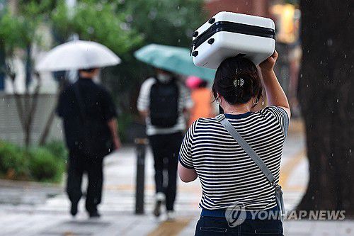 (서울=연합뉴스) 서대연 기자 = 서울 최고기온이 37도까지 오르며 무더운 날씨를 보인 8일 저녁 소나기가 내리자 한 시민이 캐리어로 머리를 가린 채 이동하고 있다. 2025.7.8