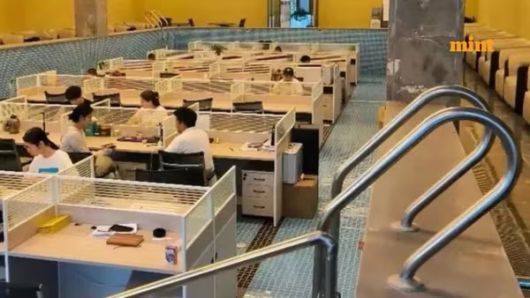 사무실 안에는 ‘수영 구역’, ‘수심 1.55m 깊은 물 구역’ 등의 표지판이 그대로 남아있고, 직원들이 수영장 사다리를 오르내리며 출퇴근하는 진풍경이 펼쳐졌습니다.