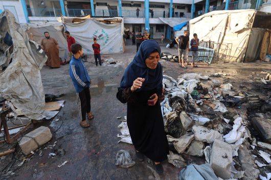 8일(현지시간) 가자지구 중부의 이스라엘 공습 현장 둘러보는 팔레스타인 피란민들 [AFP] |