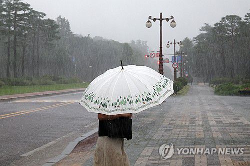 (서울=연합뉴스) 박동주 기자 = 서울 서남권에 호우주의보가 발효된 8일 서울 영등포구 여의도 국회에서 시민이 우산을 쓰고 이동하고 있다. 2025.7.8