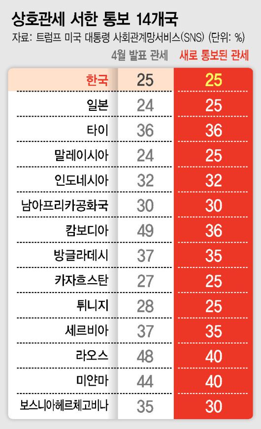 이날 한·일을 시작으로 14개국에 비슷한 방식으로 25~40%의 상호관세율을 통보한 트럼프는 행정명령을 통해서도 4월9일에 서명한 상호관세 유예 행정명령의 시효를 ‘미국 동부시각으로 7월9일 0시1분까지’에서 ‘8월1일 0시1분까지’로 연장했다. 트럼프는 “무역 파트너들과의 협상 상황에 대한 정보를 포함해 다양한 고위 당국자들로부터 받은 추가 정보와 권고 사항을 바탕으로 연장이 필요하고 적절하다고 판단했다”고 밝혔다.