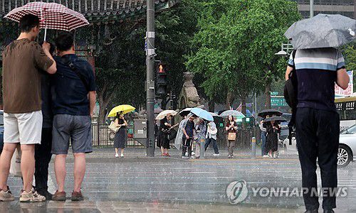 (서울=연합뉴스) 이진욱 기자 = 서울 낮 최고기온이 37도까지 오르는 등 기록적인 더위가 이어진 8일 저녁 소나기가 내린 서울 세종로사거리에서 우산을 쓴 시민들이 횡단보도 신호를 기다리고 있다. 2025.7.8
