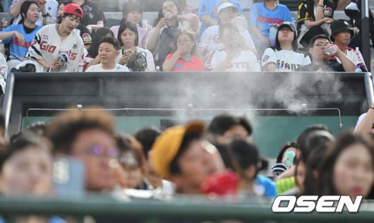 [OSEN=부산, 이석우 기자] 8일 부산 사직야구장에서 2025 신한 SOL 뱅크 KBO 리그 롯데 자이언츠와 두산 베어스의 경기가 열렸다. 홈팀 롯데는 홍민기가, 방문팀 두산은 최민석이 선발 출전했다. 폭염 주의보가 내린 부산 사직야구장 통로에 관중들의 더위를 식혀주기 위해 쿨링포그 시스템을 가동하고 있다. 2025.07.08 / foto0307@osen.co.kr