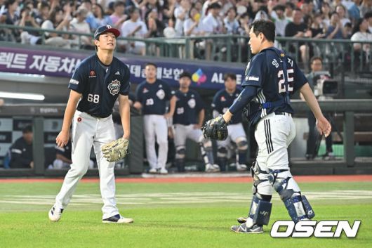 [OSEN=부산, 이석우 기자] 8일 부산 사직야구장에서 2025 신한 SOL 뱅크 KBO 리그 롯데 자이언츠와 두산 베어스의 경기가 열렸다. 홈팀 롯데는 홍민기가, 방문팀 두산은 최민석이 선발 출전했다. 두산 베어스 양의지가 5회말 롯데 자이언츠 장두성의 빗맞은 포수 앞 타구를 잡지 못하고 안타를 내주자 최민석이 아쉬워하고 있다. 2025.07.08 / foto0307@osen.co.kr
