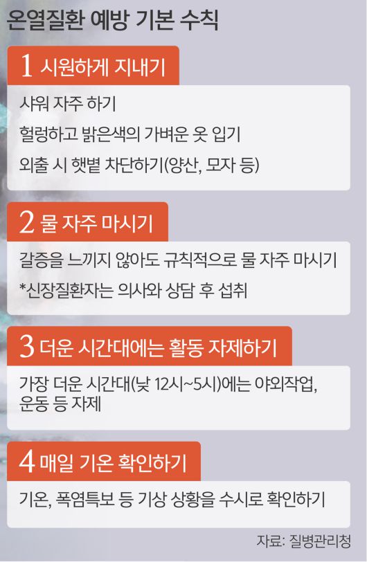 이 교수는 “체온 측정이 열사병 판단에 중요한 요소이긴 하지만 일반인이 직접 판단하기는 어렵다”며 “언행이 불분명해지거나 숨이 가빠지고 심장이 빨리 뛰며 두통·메스꺼움 등 증상이 나타나면 바로 병원에 가야 한다”고 조언했다.