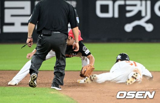 [OSEN=대전, 이대선 기자] 8일 오후 대전 한화생명볼파크에서 2025 신한 SOL Bank KBO리그 한화 이글스와 KIA 타이거즈의 경기가 열렸다. 한화는 문동주, KIA는 윤영철을 선발로 내세웠다. 4회말 무사 1루에서 한화 1루주자 문현빈이 도루에 성공하고 있다. 2025.07.08 /sunday@osen.co.kr