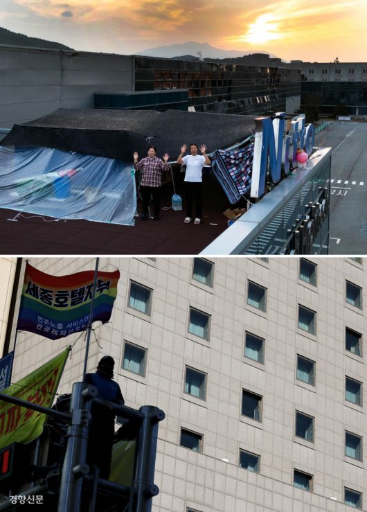 2024년 10월16일 고용승계를 요구하며 공장 옥상에 올라 고공농성을 벌이고 있는 한국옵티칼하이테크 해고노동자 박정혜(오른쪽), 소현숙씨가 농성 중인 텐트에서 나와 손을 흔들고 있다(위쪽 사진). 지난 2월17일 고진수 민주노총 서비스연맹 세종호텔지부장이 정리해고 철회를 촉구하며 고공농성을 벌이고 있다. 정지윤 선임기자·문재원 기자 |