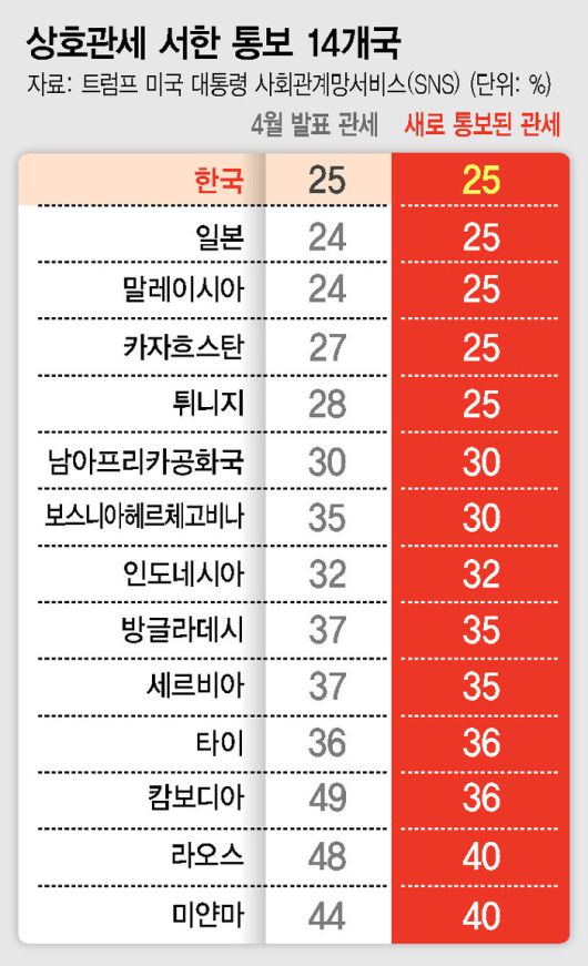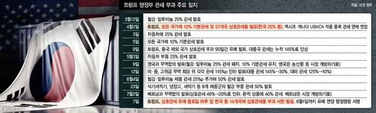 도널드 트럼프 미국 대통령이 관세 협상 상대들의 양보를 유도하려고 경고해온 ‘관세 서한’을 한국이 받자 정부는 잇따라 대책회의를 여는 등 긴박하게 움직였다. 정부는 상호관세 발효 재유예로 시간을 벌었다는 입장이지만 트럼프가 한국과 일본에 초점을 맞추는 듯한 태도를 보인 것에 긴장하며 돌파구를 모색하고 있다.