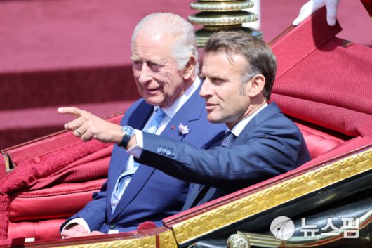 [런던 로이터=뉴스핌] 장일현 특파원 = 찰스 3세(왼쪽) 영국 국왕과 에마뉘엘 마크롱 프랑스 대통령이 8일(현지시간) 영국 런던 인근 윈저에서 1902년형 스테이트 란다우에 나란히 탑승한 채 윈저성으로 향하고 있다. 마크롱 대통령은 영국의 유럽연합(EU) 탈퇴 이후 EU 정상으로는 처음으로 2박3일 일정으로 영국을 국빈 방문했다. 2025.07.08 ihjang67@newspim.com |