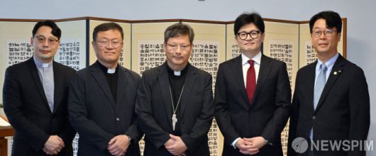 [서울=뉴스핌] 국회사진취재단 = 한동훈 국민의힘 대표가 6일 서울 중구 서울대교구청에서 천주교 서울대교구장 정순택 대주교를 예방하고 있다. 왼쪽부터 천주교 서울대교구 문화홍보국장 최광희 신부, 사무처장 정영진 신부, 정 대주교, 한 대표, 곽규택 국민의힘 수석대변인. 2024.09.06 photo@newspim.com |