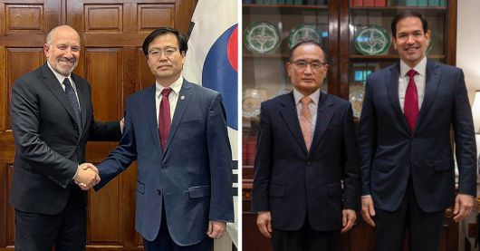 방미 중인 통상·안보 사령탑 여한구 산업통상자원부 통상교섭본부장(왼쪽 사진의 오른쪽)이 7일(현지시간) 미국 워싱턴 상무부 청사에서 하워드 러트닉 상무부 장관과 면담 기념 촬영을 하고 있다. 위성락 국가안보실장(오른쪽 사진의 왼쪽)과 마코 루비오 미국 국무장관 겸 국가안보보좌관이 7일(현지시간) 미국 워싱턴에서 열린 한·미 안보실장 협의에서 기념촬영을 하고 있다. 산업부·대통령실 제공 |