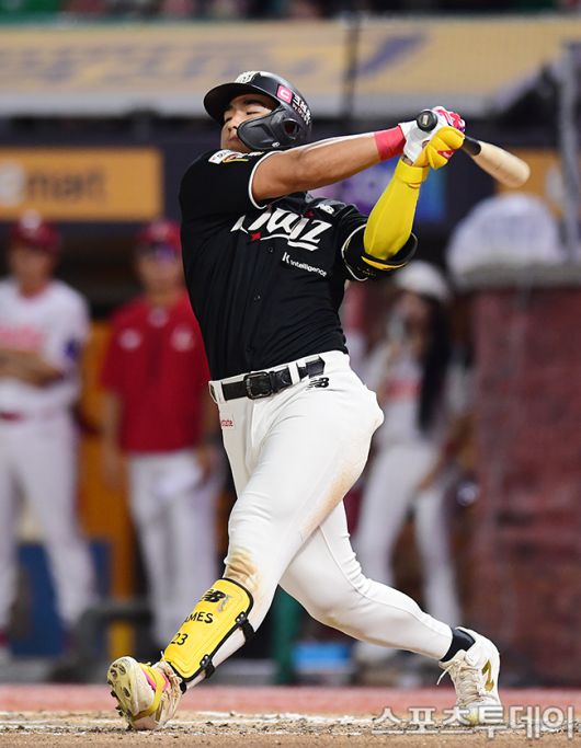 [인천=스포츠투데이 권광일 기자] 2025 신한은행 SOL Bank KBO리그 KT 위즈와 SSG 랜더스의 경기가 8일 인천 SSG랜더스필드에서 열렸다. KT 안현민이 6회초 무사에 타석에서 타격을 하고 있다. 2025.07.08. [스포츠투데이 권광일 기자 sports@stoo.com]