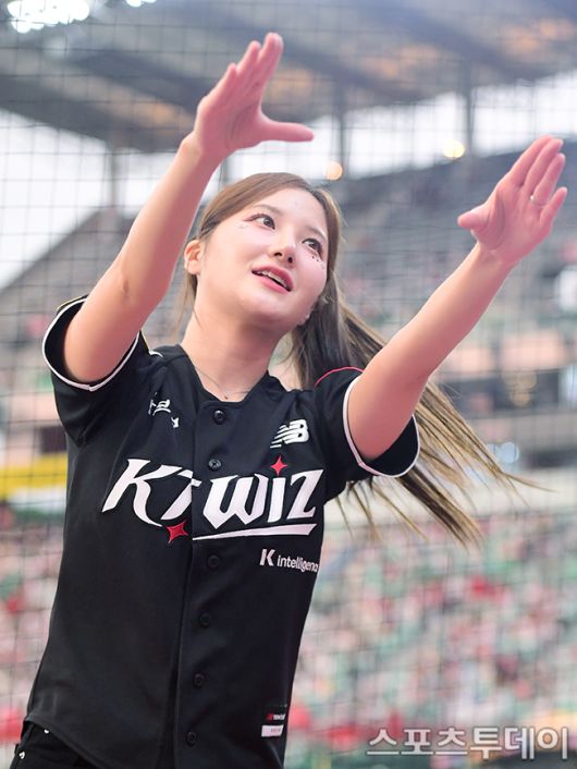 [인천=스포츠투데이 권광일 기자] 2025 신한은행 SOL Bank KBO리그 KT 위즈와 SSG 랜더스의 경기가 8일 인천 SSG랜더스필드에서 열렸다. 치어리더 김해리가 신나는 응원을 선보이고 있다. 2025.07.08. [스포츠투데이 권광일 기자 sports@stoo.com]