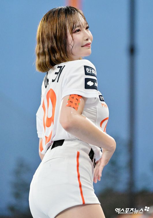 (엑스포츠뉴스 대전, 김한준 기자) 8일 오후 대전 한화생명 볼파크에서 열린 '2025 신한 SOL Bank KBO리그' KIA 타이거즈와 한화 이글스의 경기, 한화 치어리더 아야카가 열띤 응원을 선보이고 있다.김한준 기자 kowel@xportsnews.com