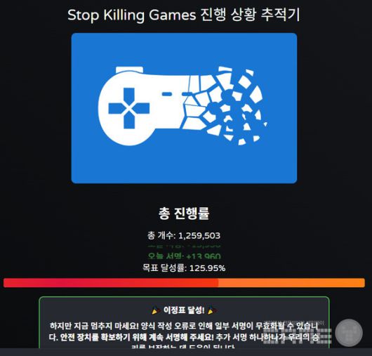 현재 스톱 킬링 게임즈 운동은 서명 인원 125만 명을 돌파했으며, 가짜 계정에 의한 무효 서명을 보완하고자 140만 명을 목표로 서명 운동을 지속하고 있다. 이는 유럽 시민 이니셔티브 제도를 통해 유럽 위원회에 직접 법안 마련을 촉구할 수 있는 기준을 훨씬 넘어선 수치다.