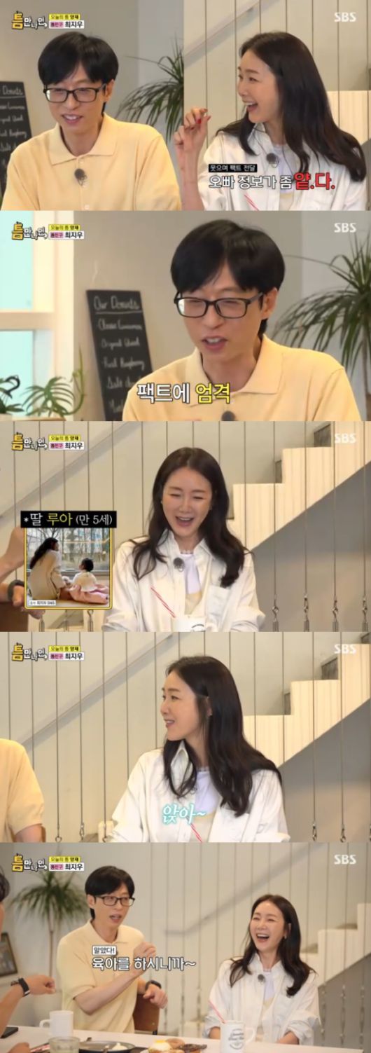 이런 최지우의 모습에 유재석은 "지우가 육아를 하니까 아닌거에는 확실한 것 같다. 매서운 느낌이 있다"고 했고, 최지우는 단호한 육아 모습을 재연해 공감을 유발했다.