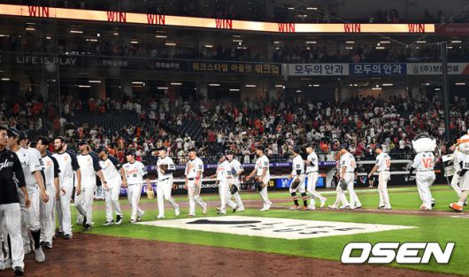 [OSEN=대전, 이대선 기자] 한화는 8일 대전 한화생명볼파크에서 열린 2025 신한 SOL Bank KBO리그 KIA 타이거즈와의 홈경기를 14-8로 승리했다. 14득점은 종전 12득점을 넘어 올 시즌 한화의 한 경기 최다 득점으로 KIA의 추격을 뿌리쳤다. 경기 종료 후 한화 선수들이 승리의 기쁨을 나누고 있다. 2025.07.08 /sunday@osen.co.kr