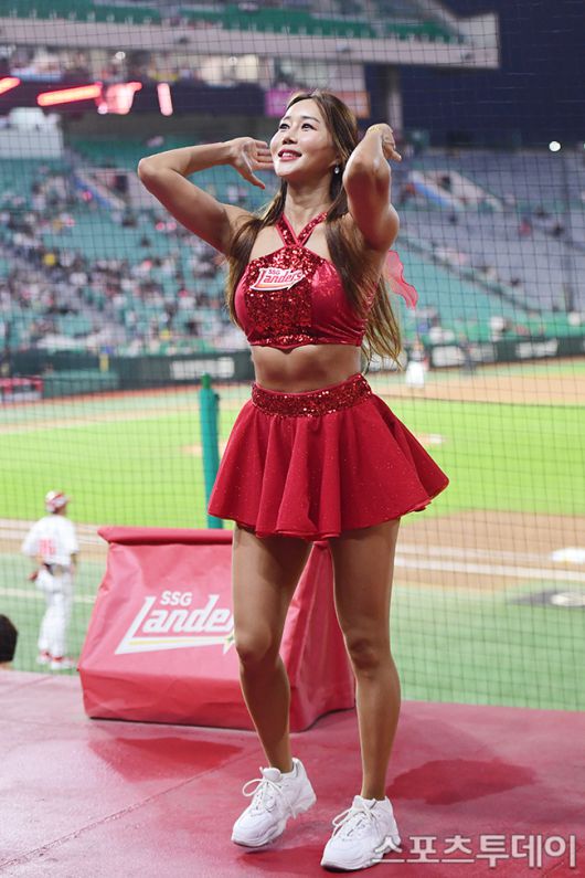[인천=스포츠투데이 권광일 기자] 2025 신한은행 SOL Bank KBO리그 KT 위즈와 SSG 랜더스의 경기가 8일 인천 SSG랜더스필드에서 열렸다. 치어리더 배수현이 신나는 응원을 선보이고 있다. 2025.07.08. [스포츠투데이 권광일 기자 sports@stoo.com]