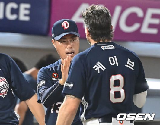 [OSEN=부산, 이석우 기자] 8일 부산 사직야구장에서 2025 신한 SOL 뱅크 KBO 리그 롯데 자이언츠와 두산 베어스의 경기가 열렸다. 홈팀 롯데는 홍민기가, 방문팀 두산은 최민석이 선발 출전했다.두산 베어스 조성환 감독 대행이 롯데 자이언츠에 8-5로 역전승하고 케이브와 하이파이브를 하고 있다. 2025.07.08 / foto0307@osen.co.kr |