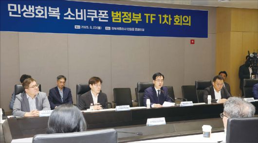 이재명정부가 총 13조2000억원 규모 전 국민 소비쿠폰을 지급하기로 했다. 사진은 김민재 행정안전부 차관이 6월 23일 정부세종청사 민원동 중회의실에서 열린 민생회복 소비쿠폰 범정부 태스크포스(TF) 1차 회의를 주재하는 모습. (연합뉴스) |