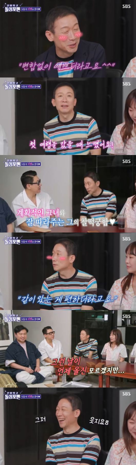이어 "아내가 귀여운 스타일이다. 변함없이 예쁘더라"면서 "연애 1년 후 처음 일본으로 여행을 갔다. 여행이 며칠간 살아보는거지 않냐. 그런데 여행 궁합이 맞더라. 같이 있는게 너무 편했다"고 했고, 탁재훈은 "가이드 느낌이었구나"라고 장난쳐 웃음을 자아냈다.