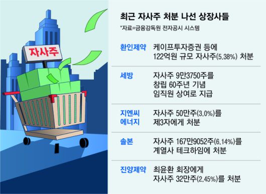 이달 상법 개정을 전후로 자사주를 처분하려는 상장사들 움직임이 분주해지고 있다. 그동안 최대주주가 경영권 방어 등 목적으로 자사주를 소각하지 않고 장기 보유하던 상황이 이어져왔다.