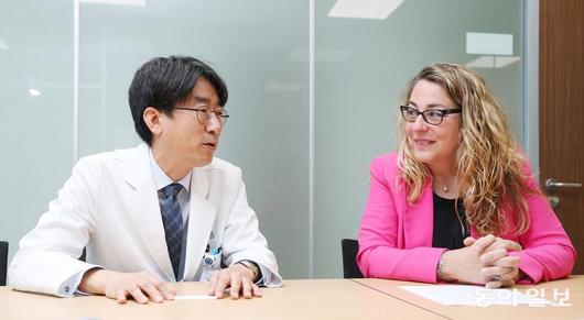 희귀질환 말단비대증 치료 환경에 대해 이야기 나누고 있는 구철룡 세브란스병원 내분비내과 교수(왼쪽)와 엘레나 발라시 유럽내분비학회 희귀질환 위원장 교수. 신원건 기자 laputa@donga.com |