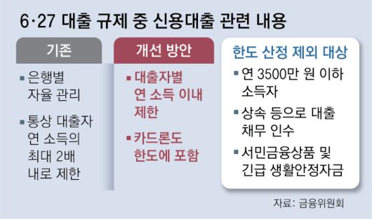 앞서 금융위원회는 수도권·규제지역 내 주담대 최대 한도를 6억 원으로 제한하는 내용의 가계부채 관리 방안을 발표하며 신용대출 한도도 대출자의 연간 소득 이내로 제한하기로 했다. 기존에는 연소득의 최대 2배까지 한도가 허용됐으나 신용대출을 활용한 주택 구입을 차단하기 위해 이 같은 조치를 꺼낸 것이다.