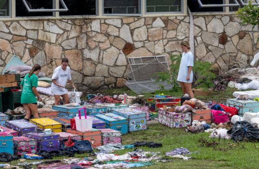 폭우에 잠긴 캠핑장… 주인 잃은 가방만 7일 홍수가 휩쓸고 간 미국 텍사스주 헌트의 ‘미스틱 캠프’ 야영장에서 관계자들이 참가 어린이들의 소지품을 정리하고 있다. 이번 홍수로 캠프에 참가한 여자 어린이 27명을 포함해 최소 104명(7일 기준)이 숨졌다. 캠프에 참여한 학생 10명, 교사 1명은 실종된 상태다. 게티이미지 |