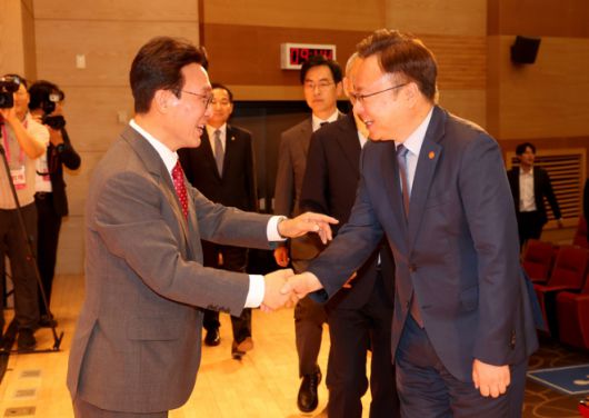 김민석 국무총리가 지난 7일 정부세종청사 대강당에서 조규홍 보건복지부 장관 등과 취임 인사를 나누고 있다. 김 총리는 이날 의료계 대표들과 비공개 만찬 회동을 갖고 의정갈등 해결 방안을 논의했다. 세종 연합뉴스 |