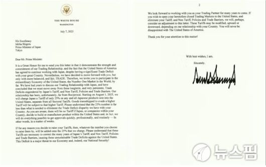 트럼프 대통령이 이시바 총리에게 보낸 관세 부과 서한 |