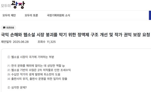 지난 28일 모두의 광장에 올라온 '웹소설 정액제 구조 개선 및 작가 권익 보장'을 요청하는 국민 제안 [홈페이지 캡쳐] |