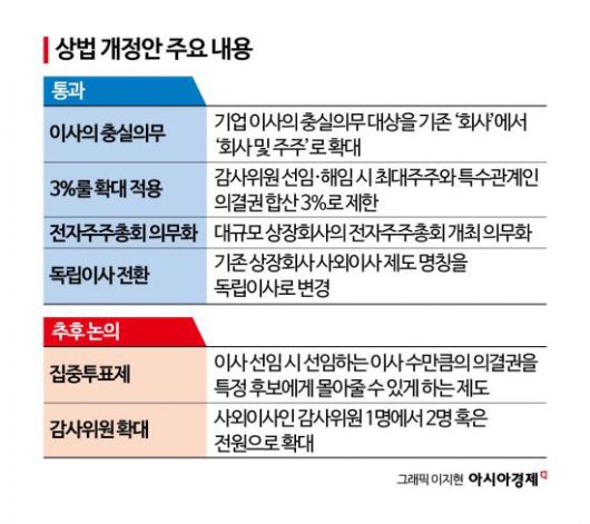 지난 3일 국회 본회의를 통과한 개정 상법은 기업 이사의 충실의무 대상을 기존 '회사'에서 '회사 및 주주'로 확대해 이사가 일반주주의 이익도 적극적으로 보호하게 했다. 또 사내이사뿐 아니라 사외이사인 감사위원 선출 시에도 최대주주 및 특수관계인의 의결권을 합산 3%로 제한했다. 이 밖에도 사외이사를 '독립이사'로 전환하고 대규모 상장사에 전자주주총회 도입을 의무화했다.