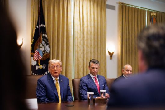 도널드 트럼프 미국 대통령(왼쪽)과 피트 헤그세스 국방장관이 8일 미국 워싱턴 디시(D.C.) 백악관 내각 회의실에서 열린 내각회의에 참석하고 있다. 워싱턴/EPA 연합뉴스 |
