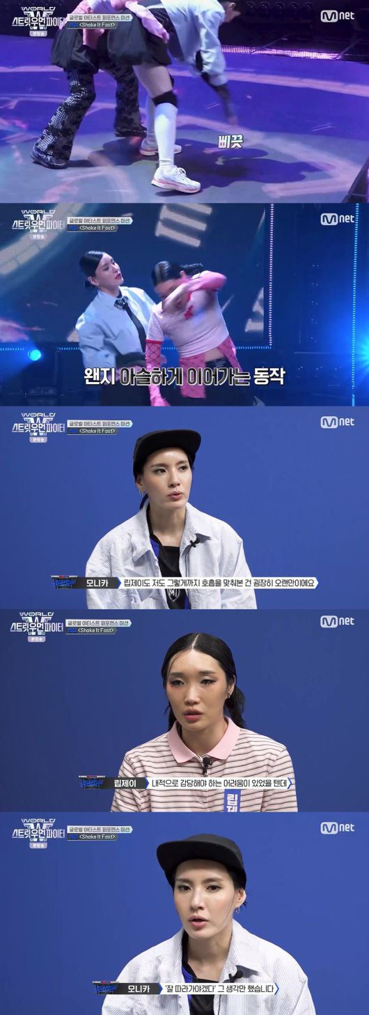 모니카 또한 "립제이도 저도 같이 호흡을 맞춰본 게 오랜만이다"라고 말했다. 두 사람은 거듭된 재시도를 하며 연습했는데, 립제이는 "직접적으로 계속 몸이 닿으면서 가야 했다. 내적으로 감당해야 하는 어려움이 있었을 텐데 마음이 너무 아팠다"라며 출산한 지 얼마 지나지 않은 모니카에 대한 걱정을 드러냈다.