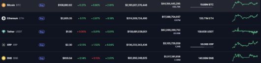 9일 글로벌 가상자산 시황중계 사이트 코인마켓캡에 따르면 이날 오전 7시 25분 기준 비트코인 가격은 24시간 전 대비 0.8% 오른 10만 8892달러를 기록했다. 일주일 전과 비교하면 2.91% 상승했다. 알트코인(비트코인 외 가상자산)의 대표격인 이더리움은 전일 대비 2.87% 상승한 2605달러에 거래됐다.