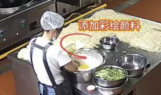 유치원 급식 반죽에 물감 투입하는 CCTV 화면. 간쑤성 톈수이시의 유치원 조리실 CCTV에 포착된 장면. 관계자가 미술용 물감을 희석한 뒤 급식 반죽에 첨가하는 모습이 담겼다. 이 유치원에서는 200명이 넘는 아동이 납중독 판정을 받았다. 중국 현지 매체 펑파이신문 동영상 캡처. |